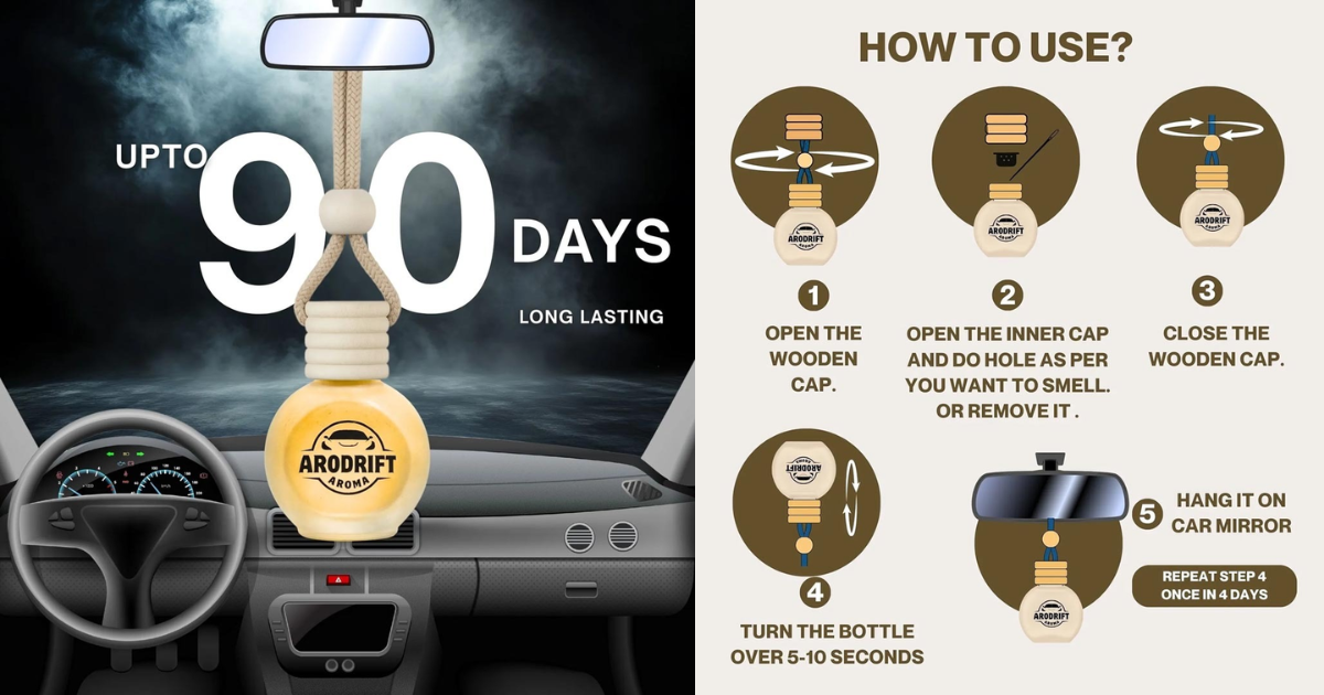 Open cap, adjust scent strength, flip bottle for saturation, hang on mirror, repeat every 4 days. This is one of those unique car dashboard accessories that improves driving mood more than expected.